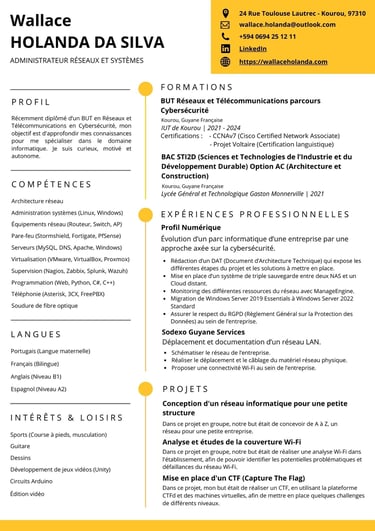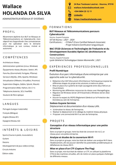Bonjour et bienvenue ! Je m'appelle Wallace Holanda da Silva, j'ai 22 ans et je suis récemment diplômé du BUT en Réseaux et Télécommunications, spécialisation Cybersécurité à l'IUT de Kourou en Guyane Française.